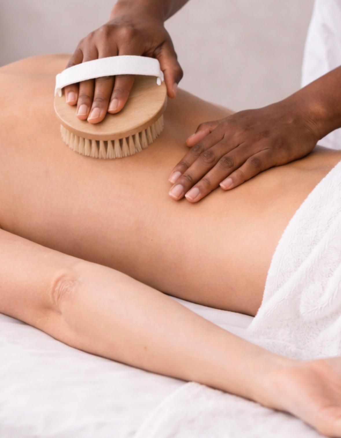 A stimulating exfoliation technique that helps remove dead skin, boost circulation, and support lymphatic flow before your massage.